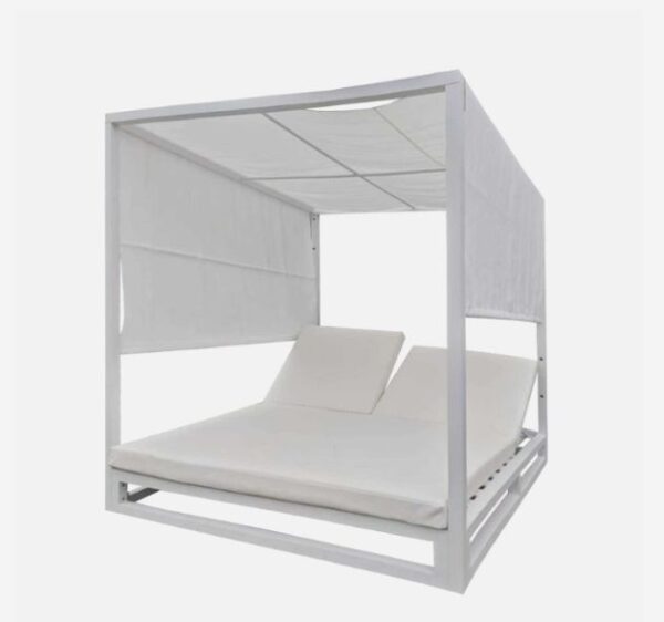 Pérgola de aluminio puro con toldo retráctil superior de textilén resistente al agua y al viento. No desgarra, protege del sol sin generar calor gracias, al micro perforado del tejido.